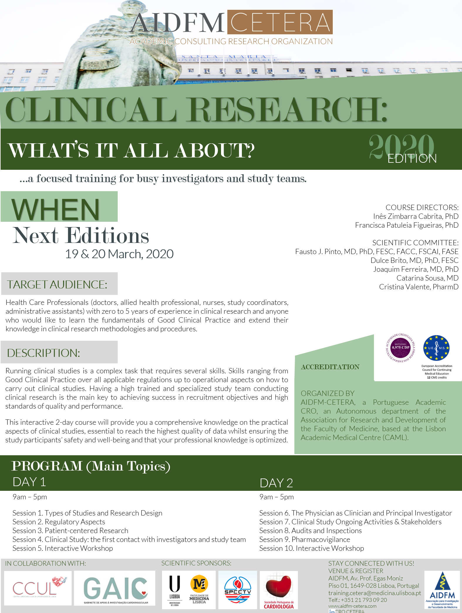 DESCRIÇÃO: Executar estudos clínicos é uma tarefa complexa que requer várias skills, desde o conhecimento das Boas Práticas Clínicas e da regulamentação aplicável aos aspetos operacionais de como conduzir estudos clínicos. Ter uma equipa altamente treinada e especializada a conduzirinvestigação clínica é a chave para alcançar sucesso nos objetivos de recrutamento e nos elevados padrões de qualidade e desempenho. Este curso é organizado em colaboração com o Gabinete de Apoio à Investigação Cardiovascular – GAIC e com o Centro Cardiovascular da Universidade de Lisboa – CCUL. Poster.pdf